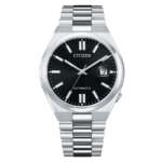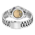 Caja de acero, 11,7mm. grosor con fondo cerrado a rosca transparente. Brazalete de acero sólido. Cristal de Zafiro. Luminous en agujas e índices. Calendario con lupa. WR 5 bar.