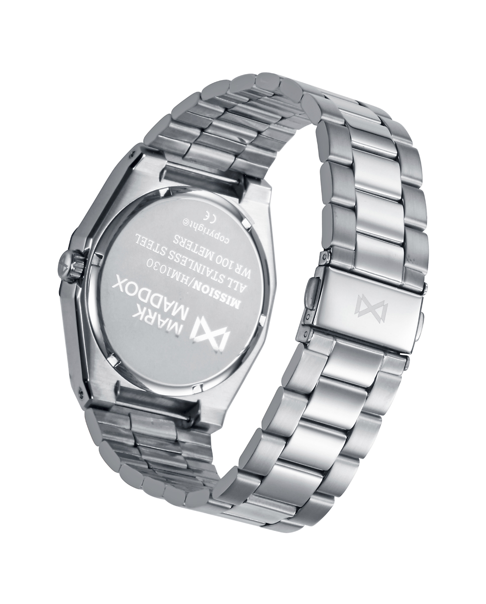 Material de caja: Acero Inoxidable. Mecanismo: Cuarzo analógico. Cristal mineral. Material de correa: Acero Inoxidable. Cierre: Desplegable mediante doble pulsador.